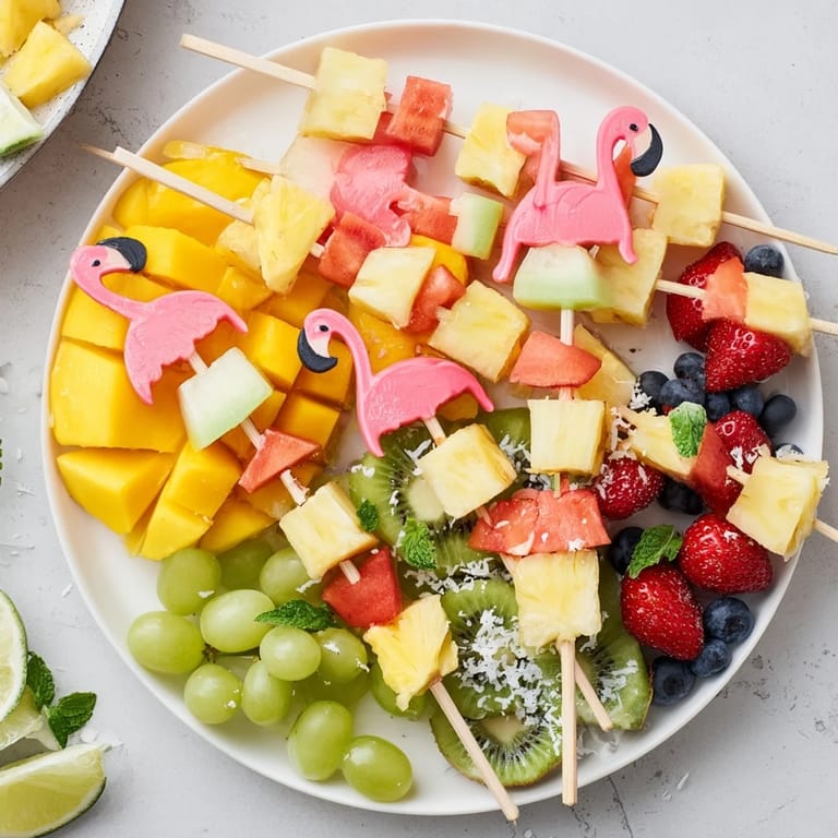 Pin This A vibrant, fun, and healthy tropical fruit platter featuring playful flamingo-shaped skewers—perfect for parties and summer gatherings.